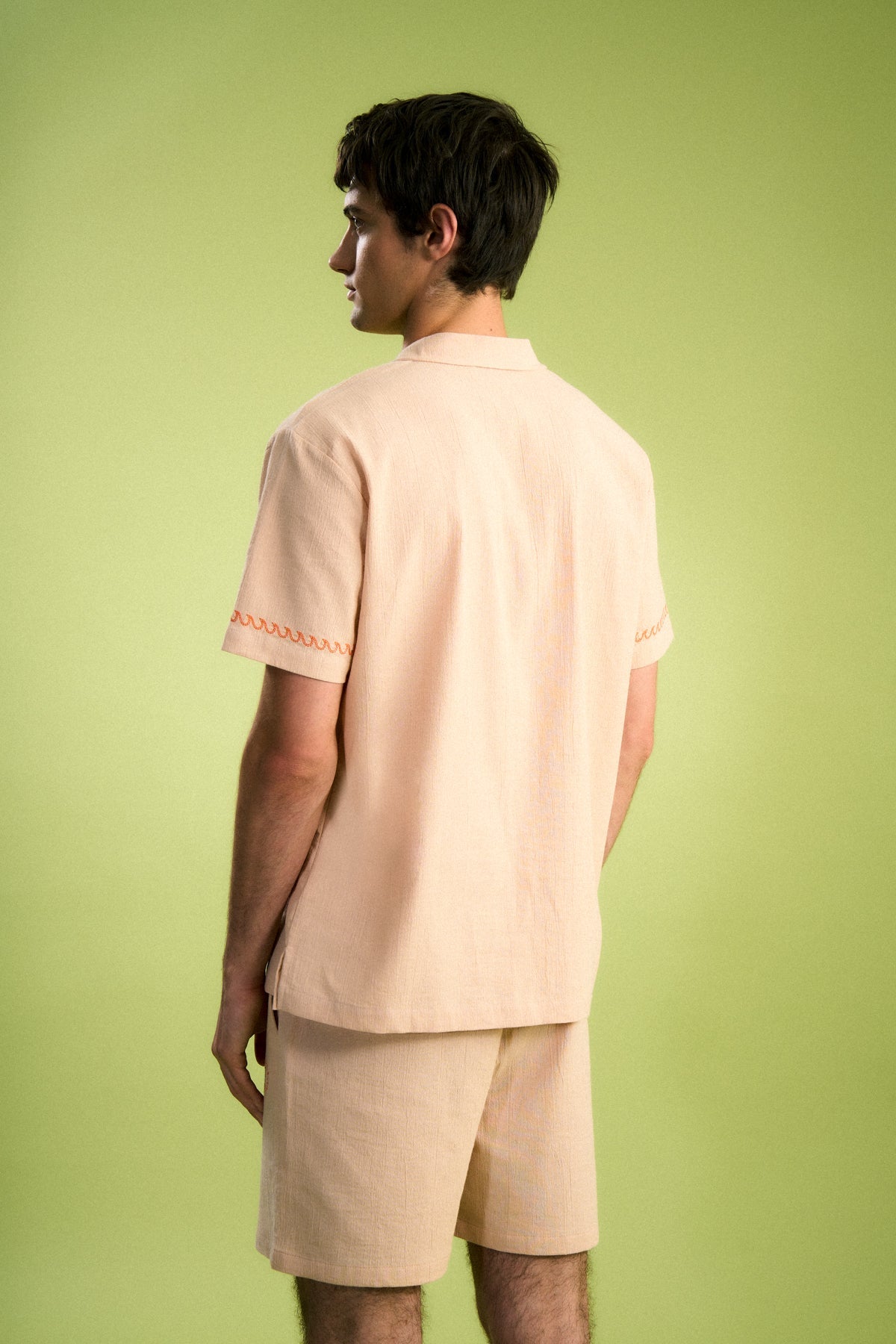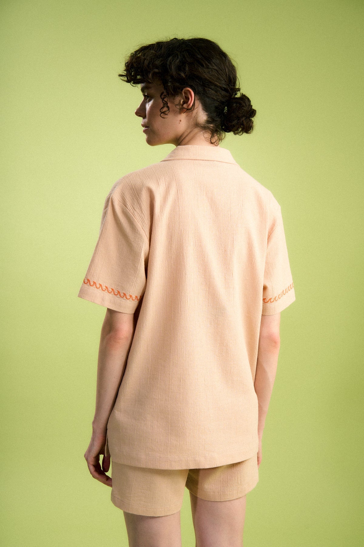 Bowling yaka detaylı bu unisex gömlek, kısa kollu ve düz kesimlidir. Önü tam boy düğme kapamalı tasarımıyla klasik bir görünüm sunarken, hafif ve nefes alabilen müslin kumaşı sayesinde gün boyu konforlu bir kullanım sağlar.