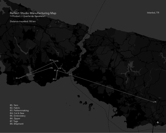 As an Istanbul-based design + manufacturing office, our headquarters and our manufacturing network are based in Istanbul. When an order is placed and the designs are ready, production sheets are prepared in-house, where the selection of raw materials is conducted together with creative and production teams. Our production planner, together with the lead, sources every single item on a garment. Within an average of four to six weeks, Reflect Studio production team of six people (production lead, lead assistant, planner, quality controller, two operation assistants) pursues every single step in the production chain, the quality controller visiting and checking every single supplier at each stage, covering a total 116 kilometres within the city of Istanbul, in the following order. Compared to the industry-standard global supply chain operations, our end-to-end local manufacturing approach results in carbon-efficient operations.